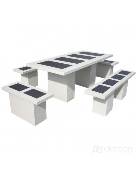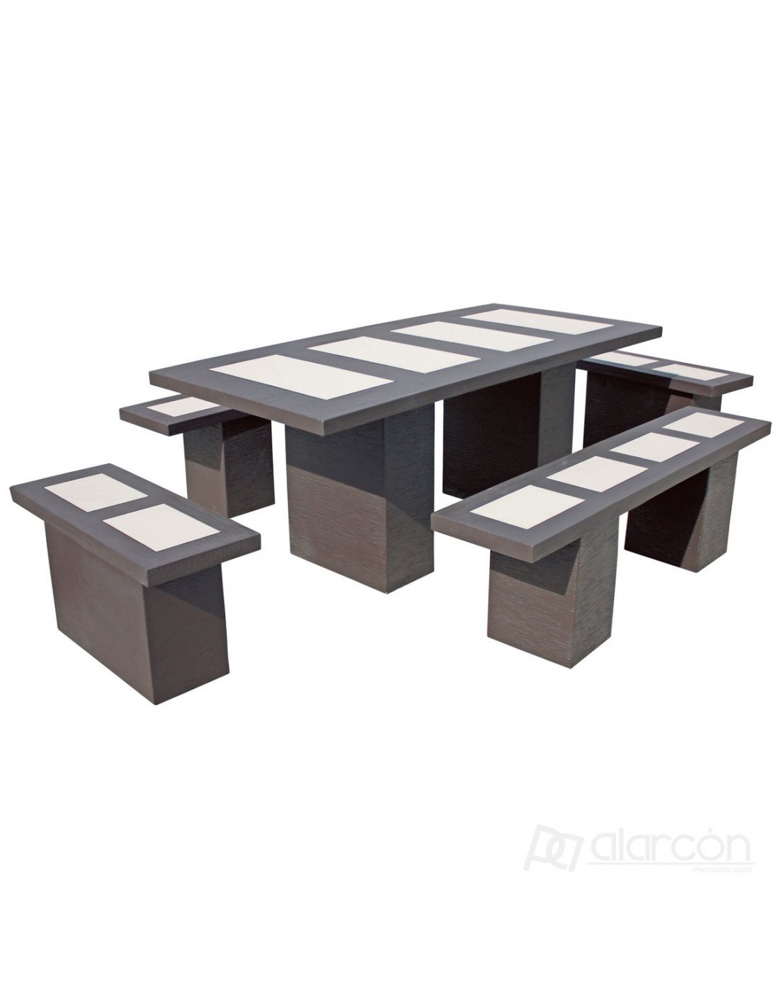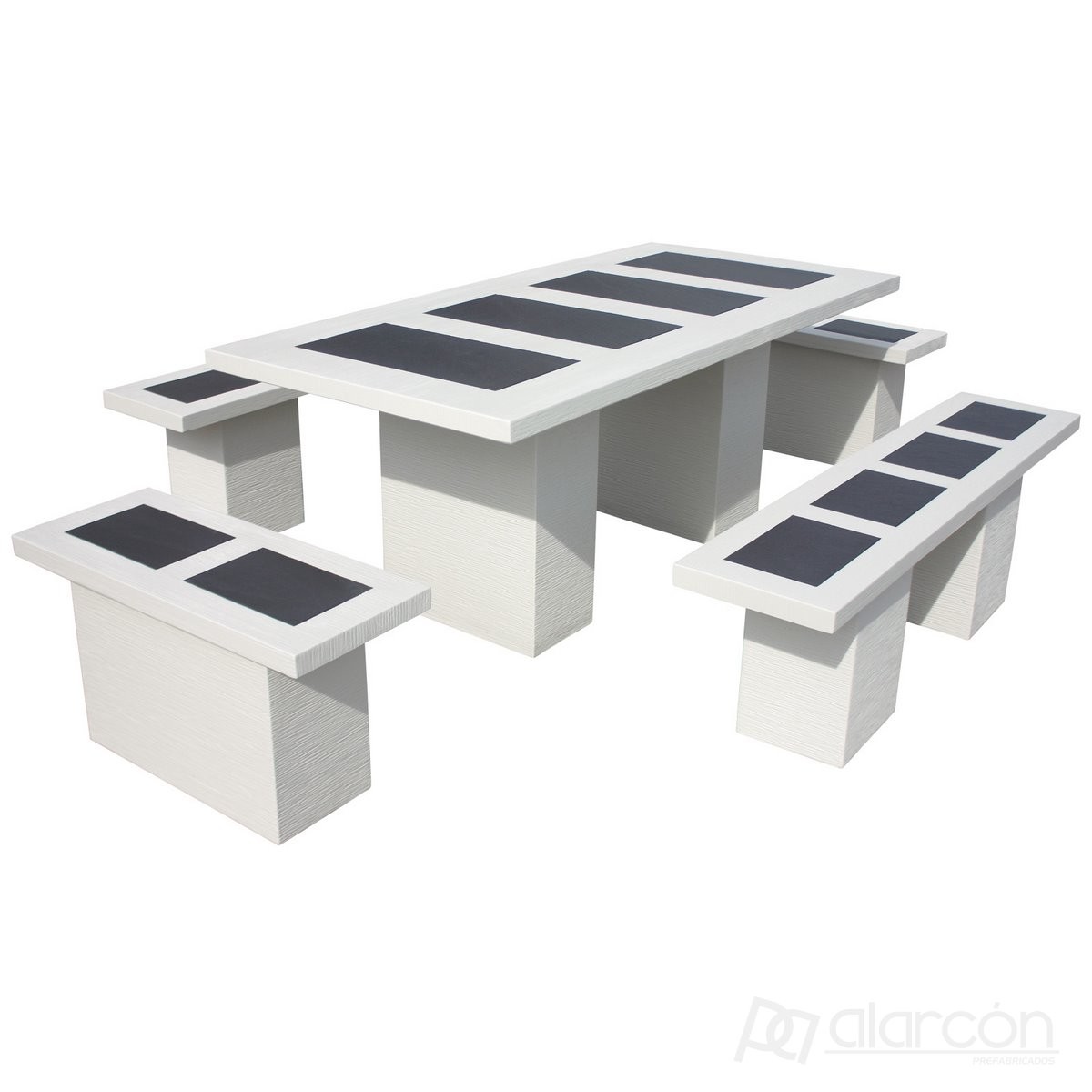 Conjunto de comedor fabricado en hormigón con alta durabilidad, preparado para el uso en exterior, compuesto por 1 mesa ovalada, 2 bancos curvos y 2 bancos rectos.