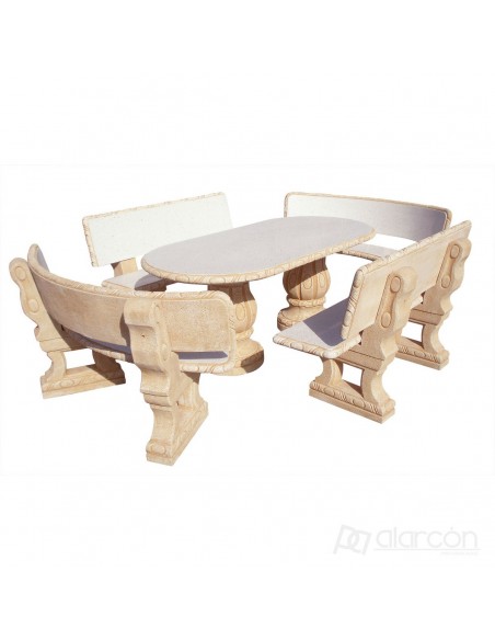 Conjunto de comedor fabricado en hormigón con alta durabilidad, preparado para el uso en exterior, compuesto por 1 mesa redonda y 3 bancos curvos, acabado decorado.