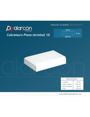 Cubremuros plano terminal de hueco interior 20,5 cm. fabricado en hormigón, reforzado mediante fibra de vidrio en el material y aditivos para el cemento