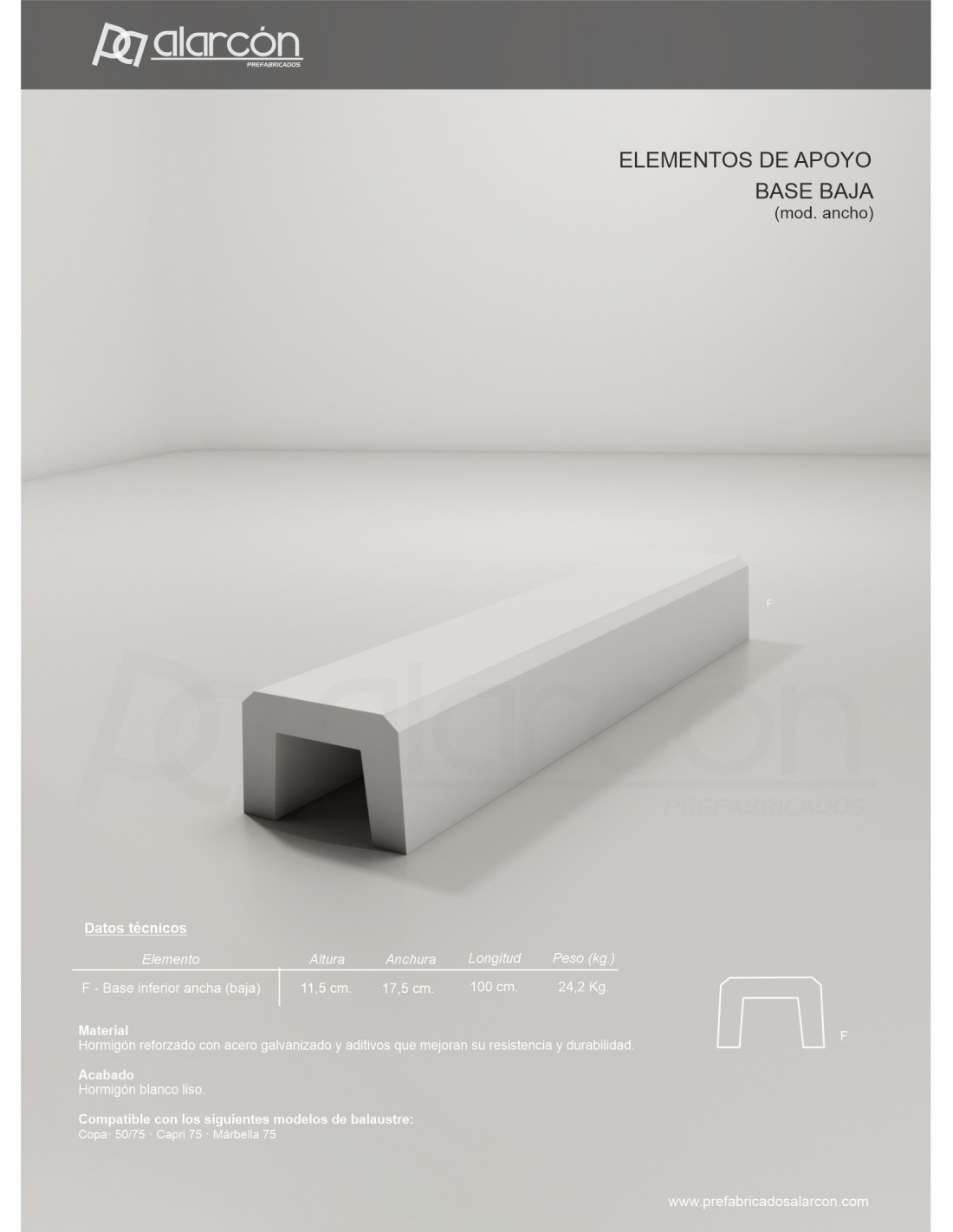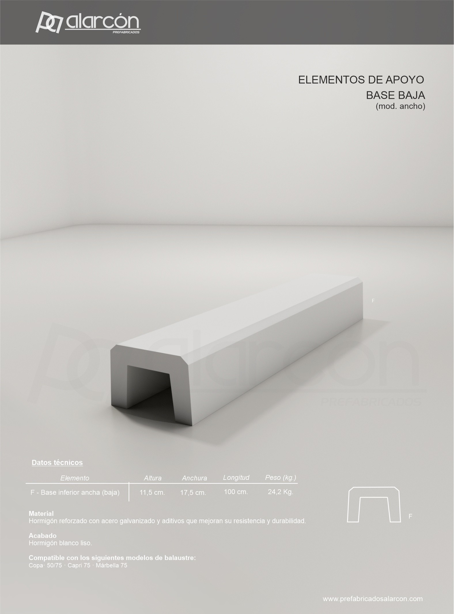 Pz. Base baja ancha fabricada en hormigón blanco con hierro galvanizado
