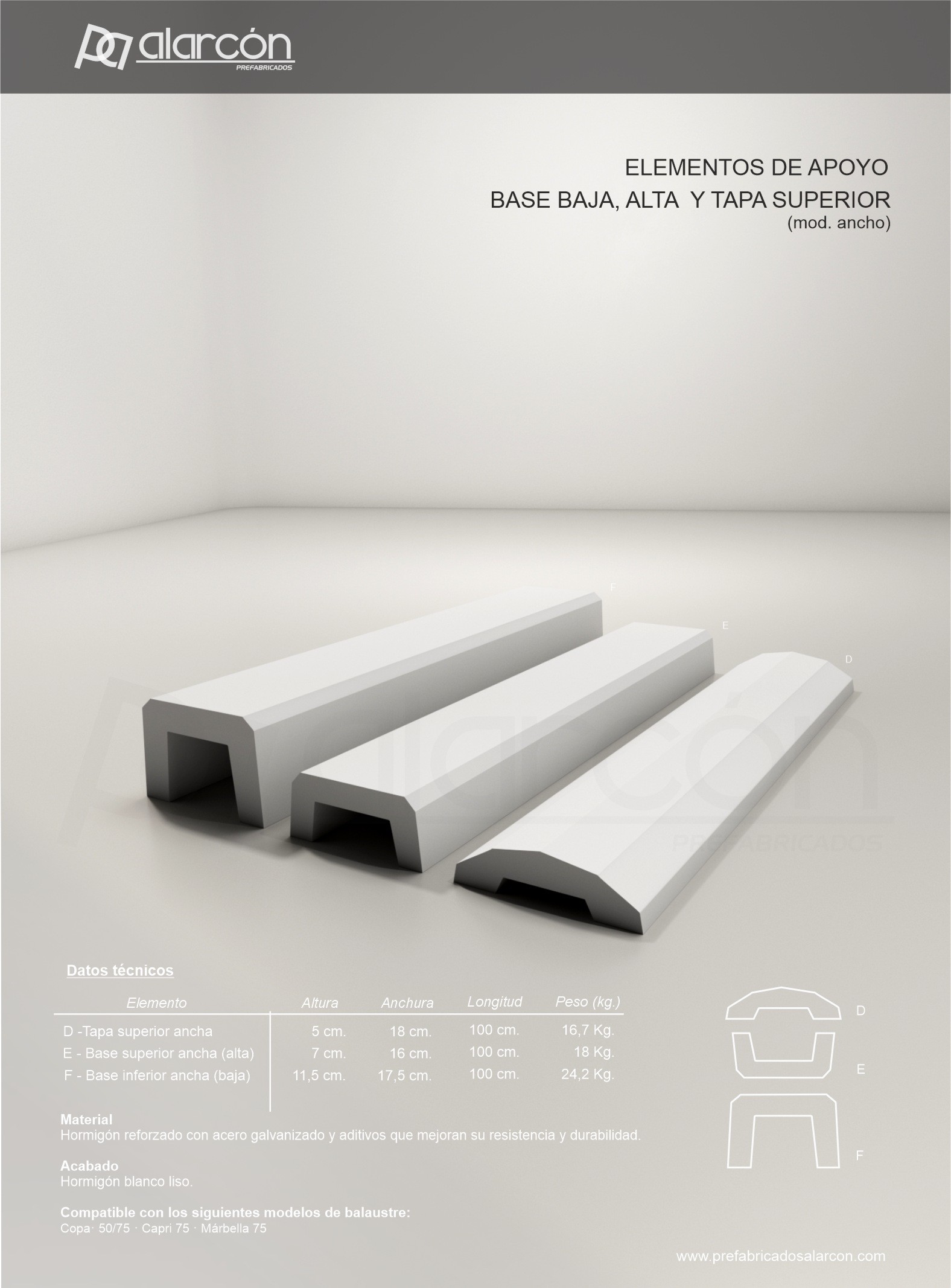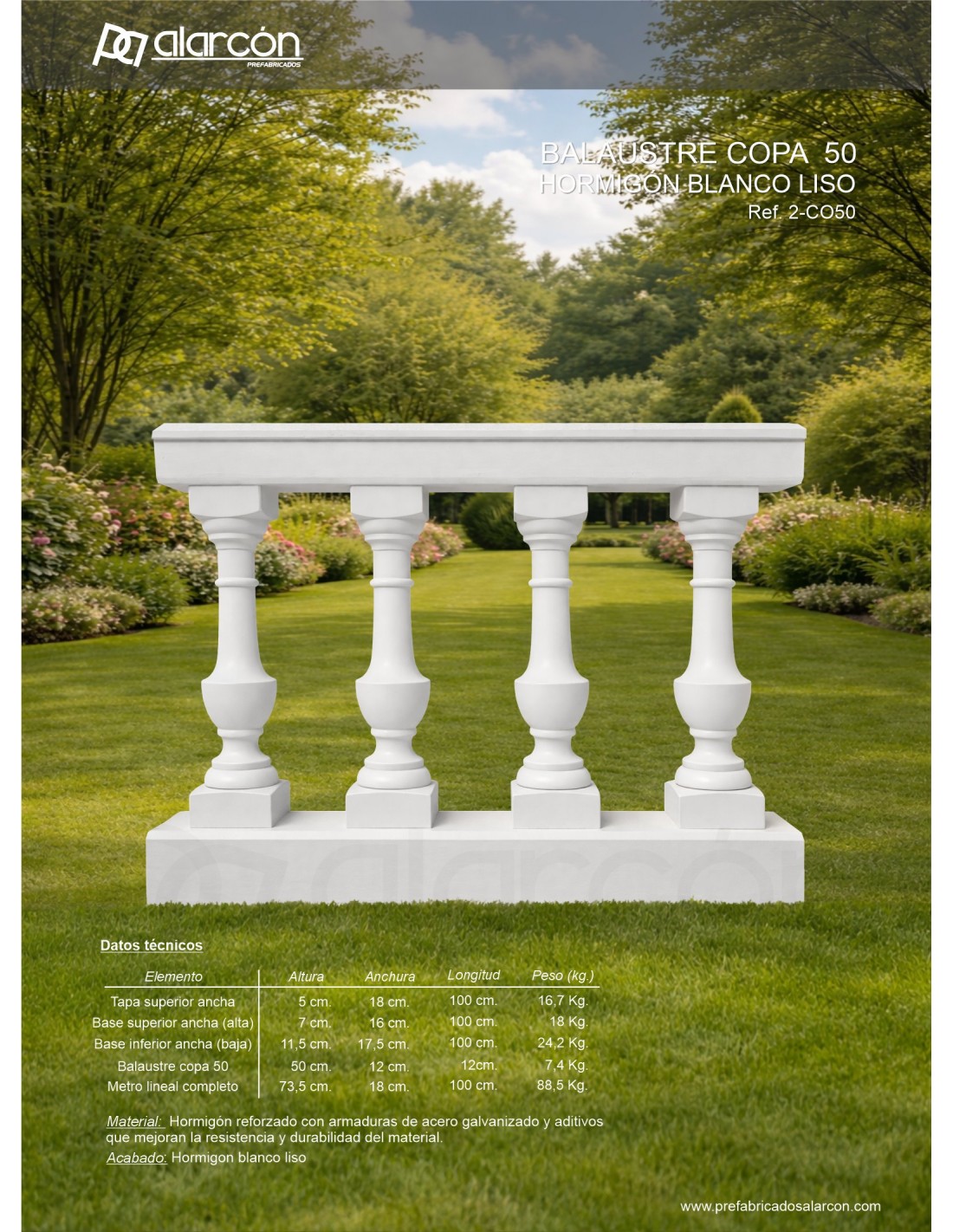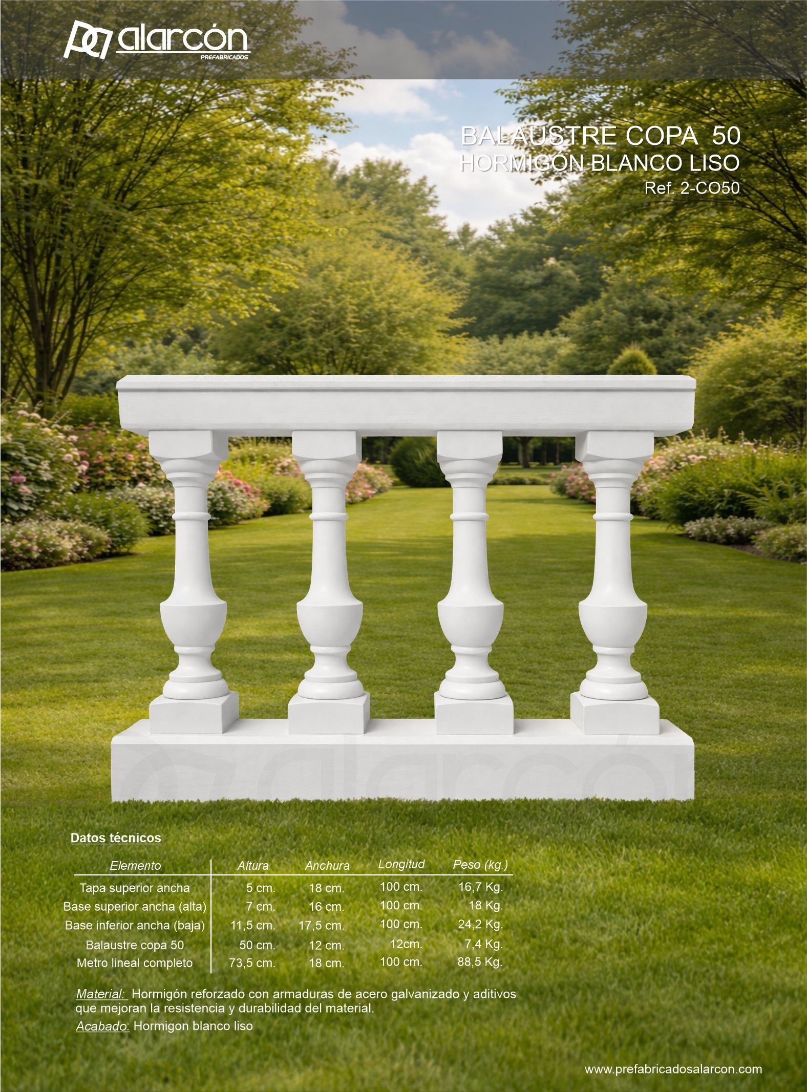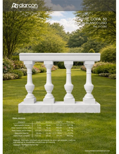 Descripción Balaustre de hormigón prefabricado modelo Málaga 70, diseñado para la creación de barandillas decorativas en exteriores. Fabricado con hormigón reforzado y armaduras de acero galvanizado, ofrece alta resistencia, durabilidad y estabilidad. Su diseño estilizado aporta un acabado elegante y se integra fácilmente en jardines, terrazas y espacios...