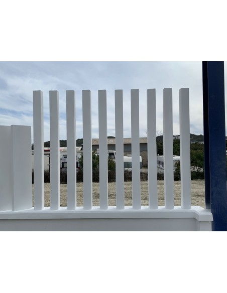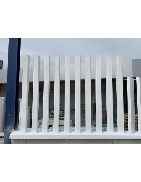Paraviento fabricado en hormigón blanco, incluye fibra de vidrio en el material y aditivos para el cemento.
