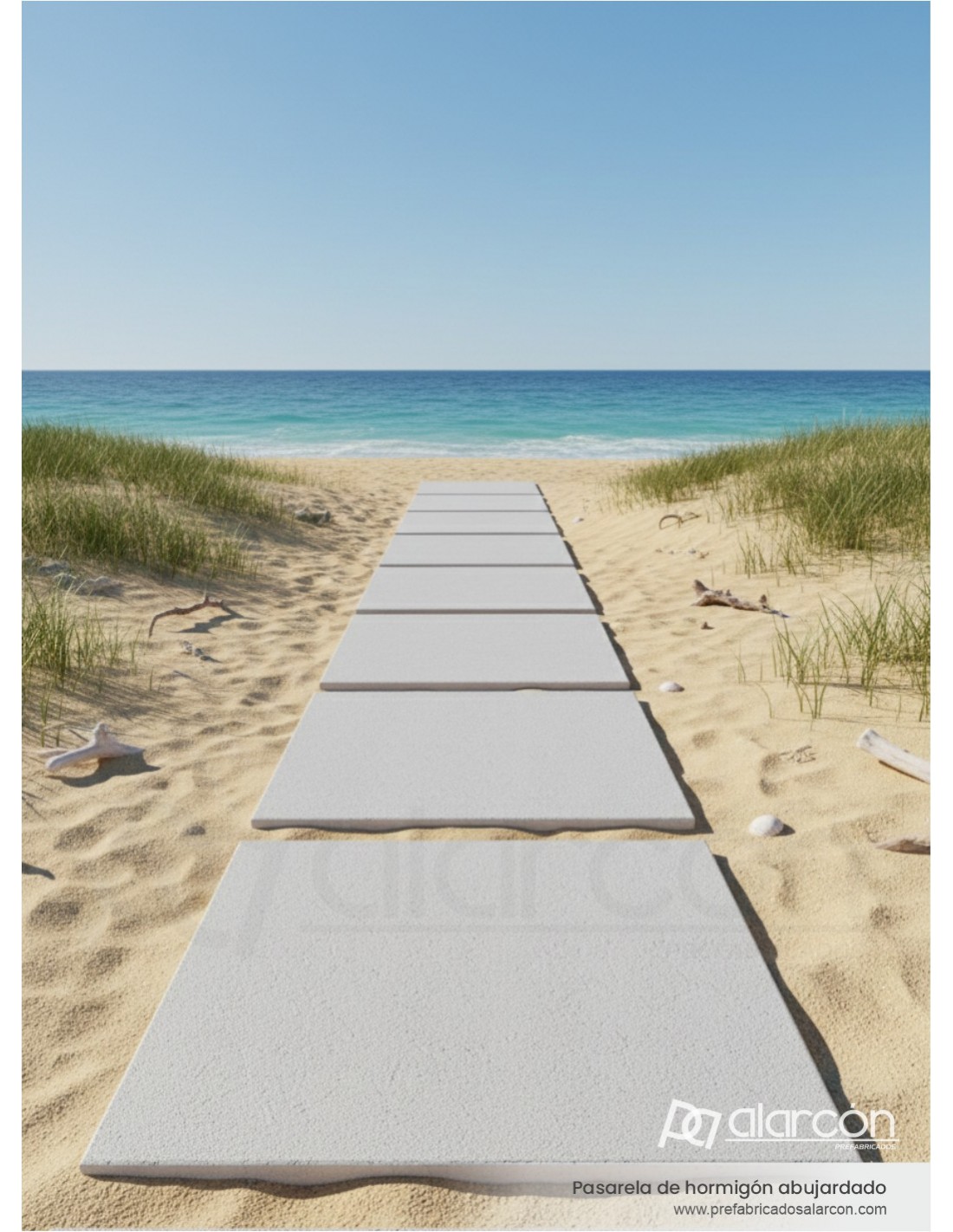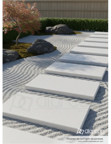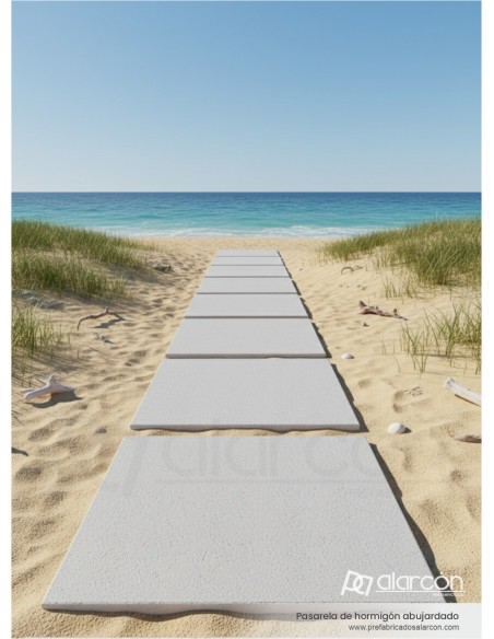 Pasarela prefabricada de hormigón abujardado de 120×120 cm, fabricada con armaduras de refuerzo, fibra de polipropileno y aditivos para el cemento que mejoran su resistencia y durabilidad en exteriores. Su acabado antideslizante la hace ideal para caminos, jardines y zonas peatonales. Disponible en distintos espesores.