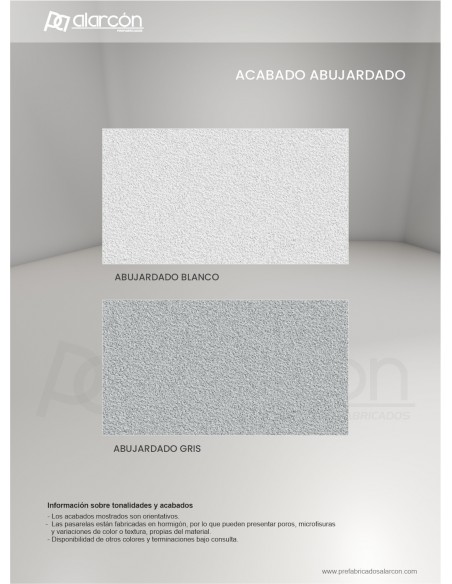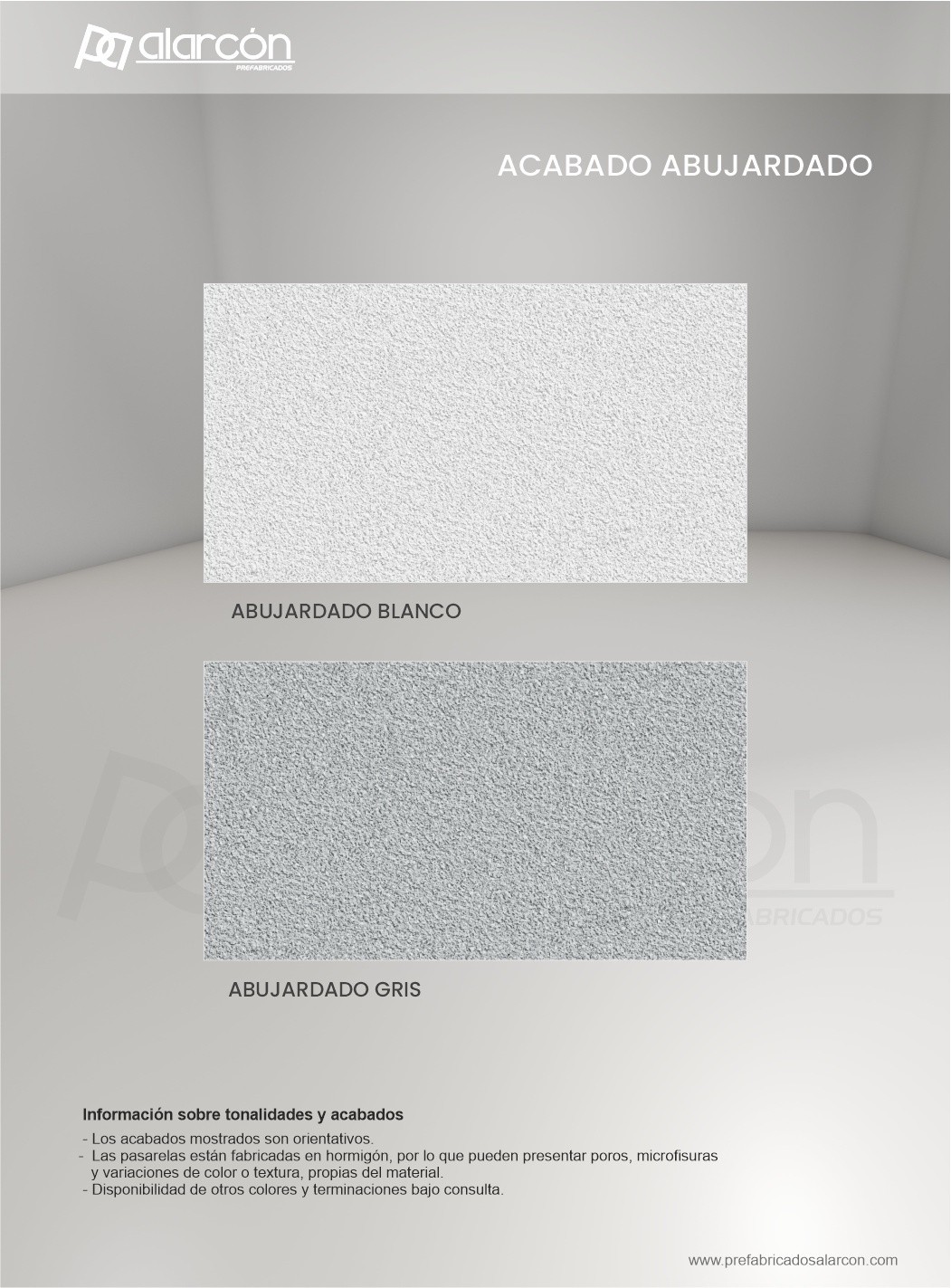 Las pasarelas están fabricadas en hormigón, por lo que pueden presentar poros, microfisuras y variaciones de color o textura, propias del material y sin afectar a su resistencia.