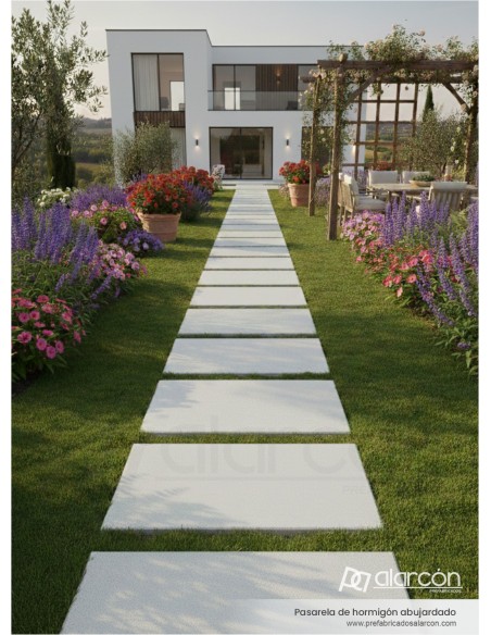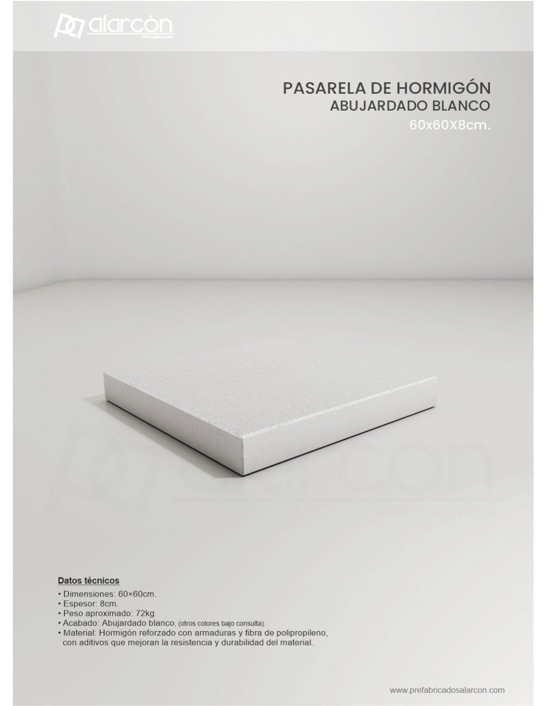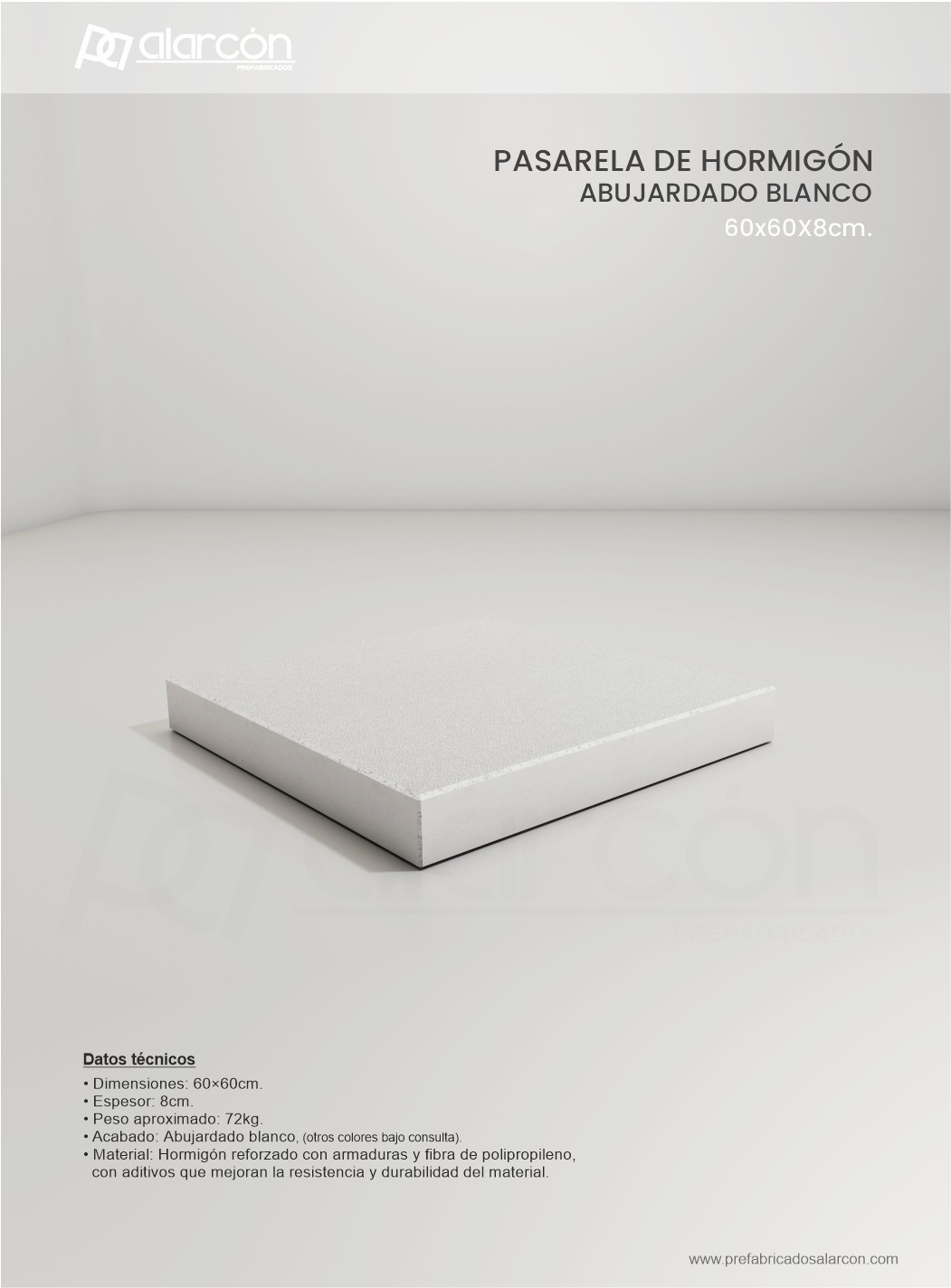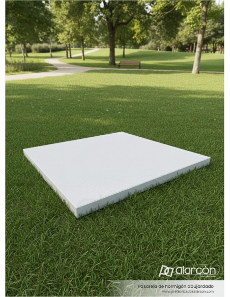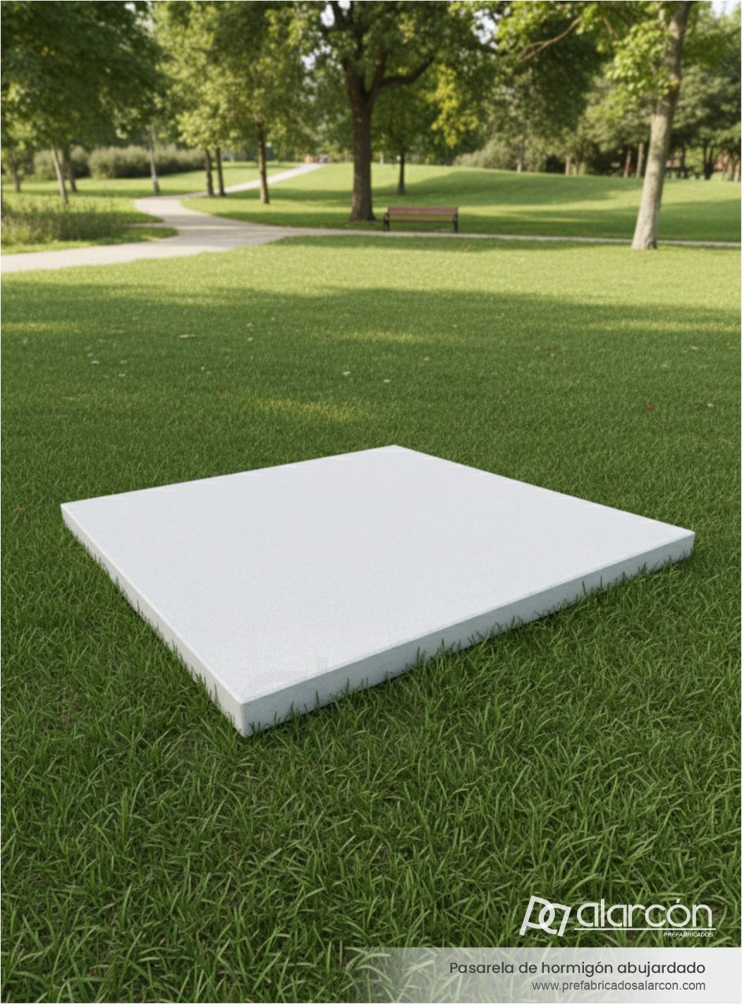Pasarela prefabricada de hormigón abujardado de 60×60 cm, fabricada con armaduras de refuerzo, fibra de polipropileno y aditivos para el cemento que mejoran su resistencia y durabilidad en exteriores. Su acabado antideslizante es ideal para senderos, jardines y zonas peatonales. Disponible en distintos espesores según proyecto.