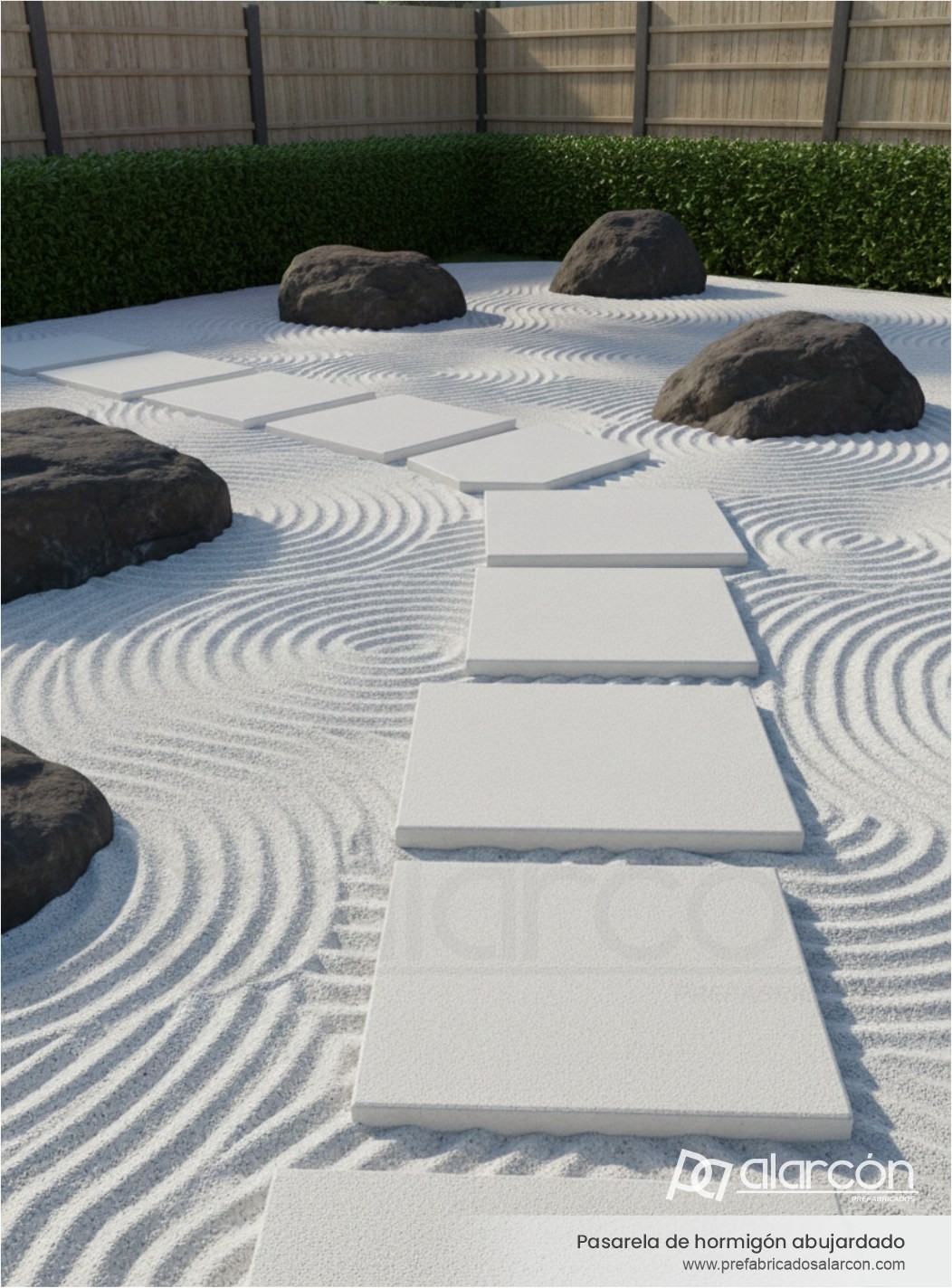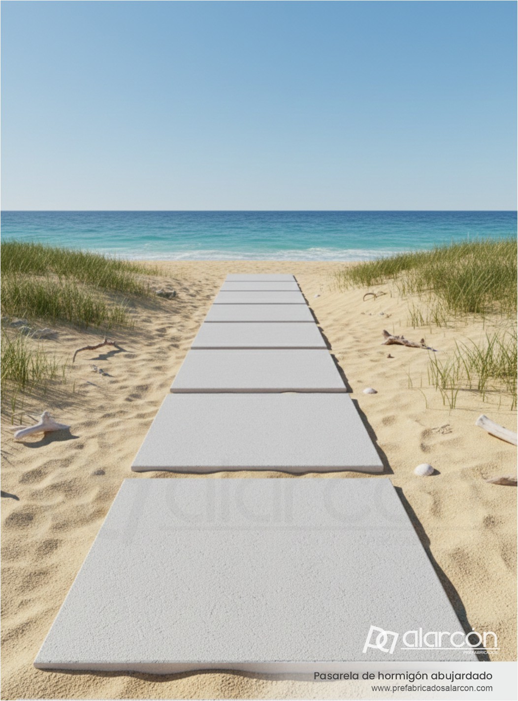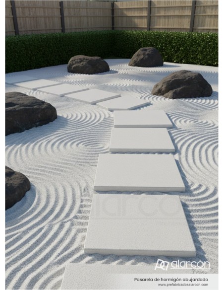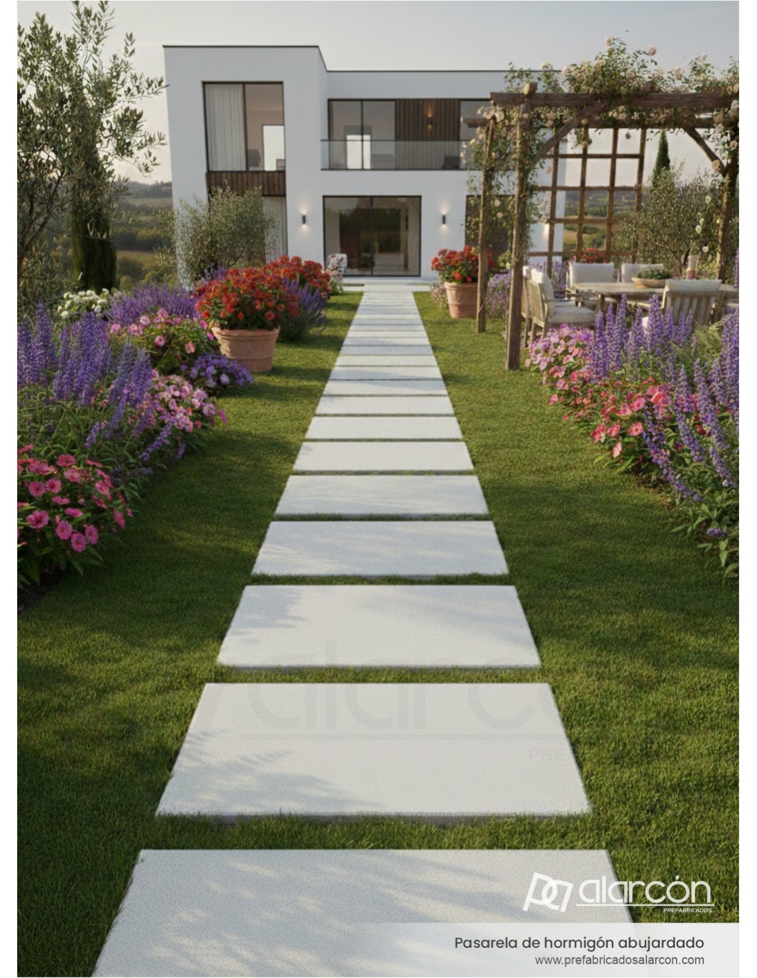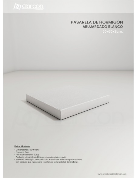 Pasarela prefabricada de hormigón abujardado de 60×60 cm, fabricada con armaduras de refuerzo, fibra de polipropileno y aditivos para el cemento que mejoran su resistencia y durabilidad en exteriores. Su acabado antideslizante es ideal para senderos, jardines y zonas peatonales. Disponible en distintos espesores según proyecto.