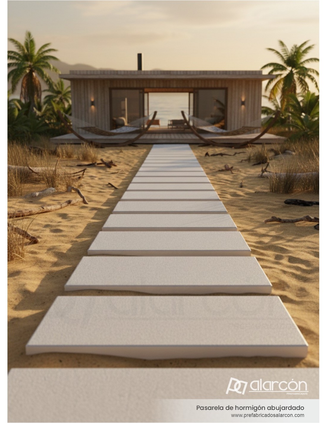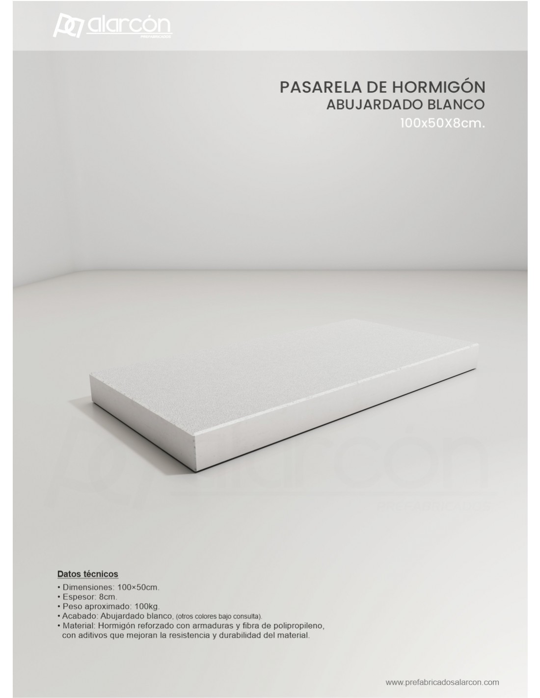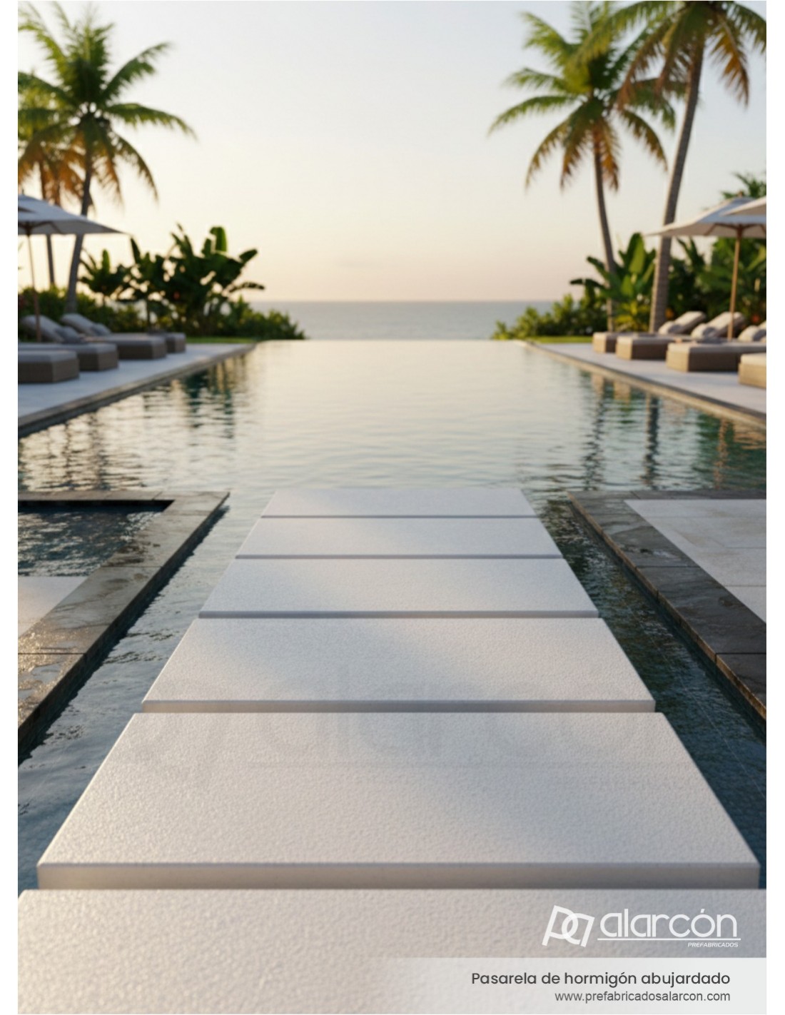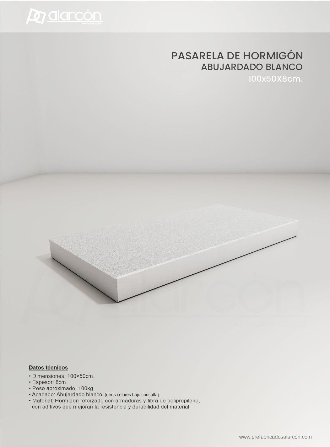 Pasarela prefabricada de hormigón abujardado de 100×50 cm, fabricada con armaduras de refuerzo, fibra de polipropileno y aditivos para el cemento que mejoran su resistencia y durabilidad en exteriores. Su acabado antideslizante es ideal para senderos, jardines y zonas peatonales. Disponible en distintos espesores según proyecto.