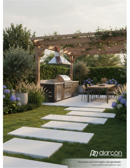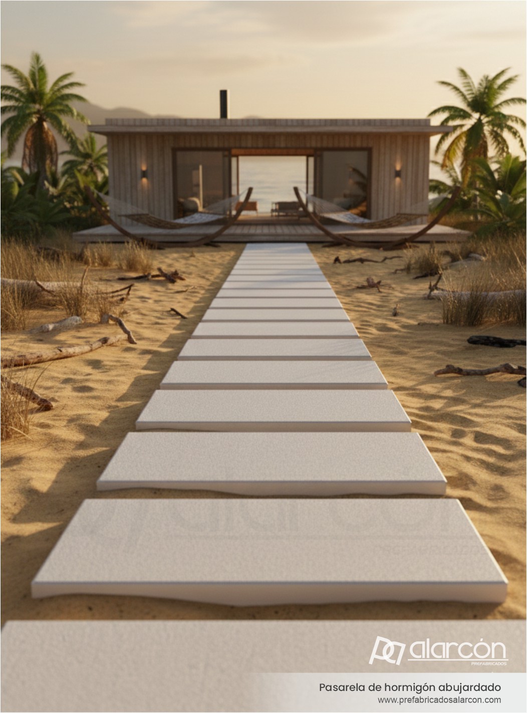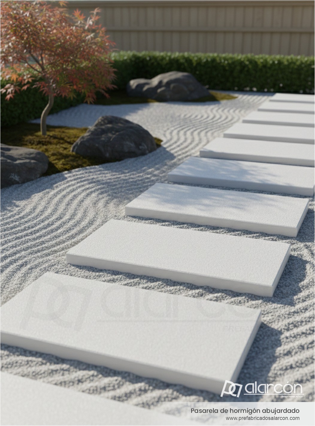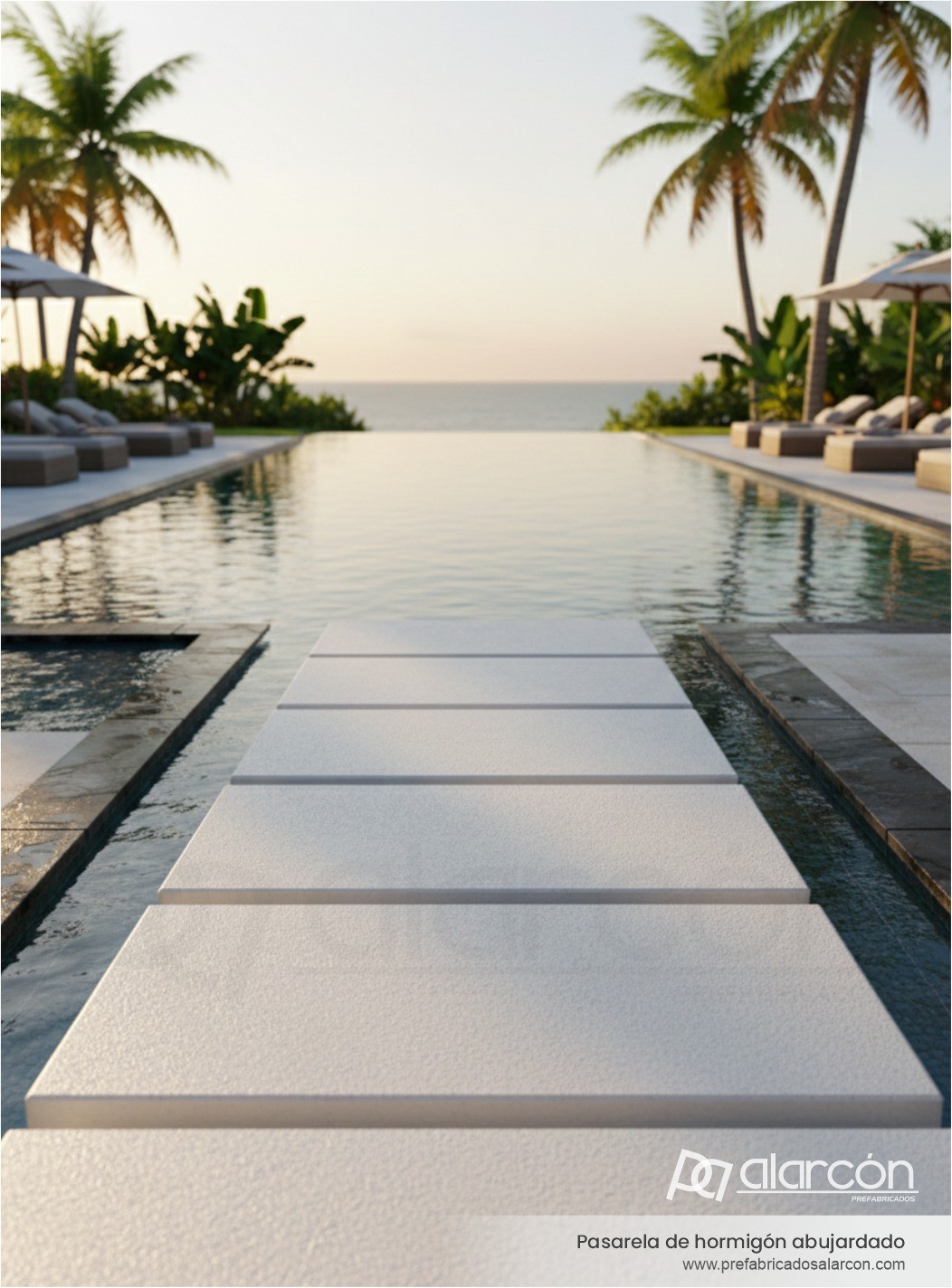 Pasarela prefabricada de hormigón abujardado de 100×50 cm, fabricada con armaduras de refuerzo, fibra de polipropileno y aditivos para el cemento que mejoran su resistencia y durabilidad en exteriores. Su acabado antideslizante es ideal para senderos, jardines y zonas peatonales. Disponible en distintos espesores según proyecto.