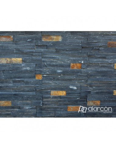 Revestimiento para paredes y/o suelos de piedra natural formada por pizarra multicolor marrón con alternancia de tonos rojos y dorados y marcada exfoliación, aptas para uso interior y exterior.
